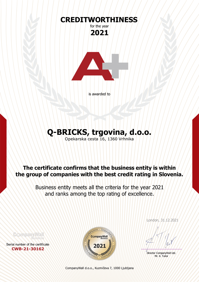 by Mr. Bizjak and Mrs. Debevec with same base philosophy but with fresh energy. Goal of Q-BRICKS® is to expand the market also outside the EU and to expand the product portfolio in limits of Classic program where creativity of individual can run free. You can expect new and good things to happen in near future.