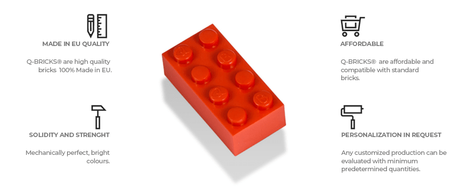 All Q-BRICKS® blocks are 100% produced and assembled in Slovenia under strict production control which applies to ISO 9001:2015 and ISO 14001 standard. This means that Q-BRICKS® blocks are dimensionally perfect. We are using only highest quality materials and colours for our production, therefore Q-BRICKS® blocks are mechanically perfect high-quality blocks in bright colours.