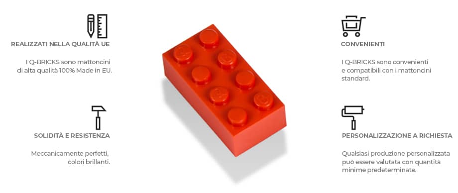 I mattoncini Q-BRICKS® sono resistenti come i mattoncini originali prodotti in Danimarca negli anni ‘60. Questo significa che lo spessore della parete dei mattoncini Q-BRICKS® è di 1,5 mm e non di 1,2 mm come gli attuali mattoncini danesi. I mattoncini Q-BRICKS® sono quindi adatti ai fan del “retro revival”, o a chiunque altro preferisca una struttura semplice ma robusta, particolarmente adatta a realizzare costruzioni di grandi dimensioni e molto stabili, edifici, MOC.