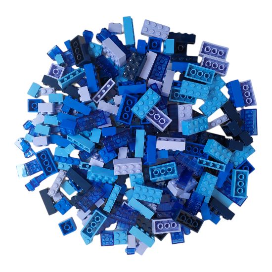 Mix di mattoncini blu, contiene 300 pezzi di mattoncini di dimensioni 1×1 (60 pezzi), 1×2 (60 pezzi), 1×4 (60 pezzi), 2×2 (60 pezzi) e 2×4 (60 pezzi) di diverse tonalita di blu (azzurro cielo, azzurro cielo trasparente, azzurro chiaro, blu zaffiro, lavanda).