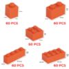 La scatola di un set di colori con mattoncini di diverse dimensioni e adatta per idee di costruzione creative. Il set contiene 300 mattoncini di dimensioni 1×1 (60 pezzi), 1×2 (60 pezzi), 1×4 (60 pezzi), 2×2 (60 pezzi) e 2×4 (60 pezzi). RAL colore: arancio 2004
